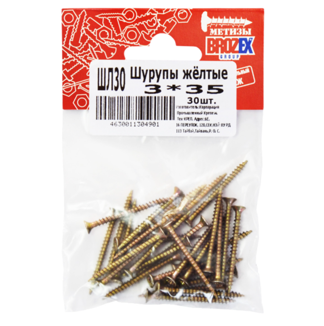 Шурупы жёлтые BROZEX пакет 3*35 (30шт) *10/100