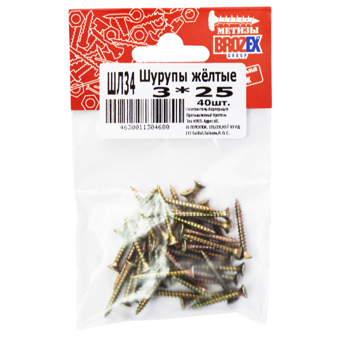 Шурупы жёлтые BROZEX пакет 3*25 (40шт) *10/100
