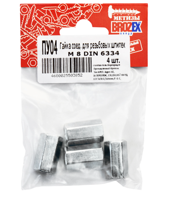 Гайка соедительная д/резьб.шпилек М8 DIN 6334 BROZEX (4шт) *10/100