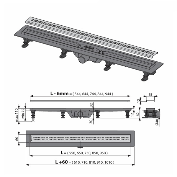 AlcaPlast. APZ10-550M "Симпл" желоб водоотводящий L 550 мм, с порогами, для перфорированной решетки