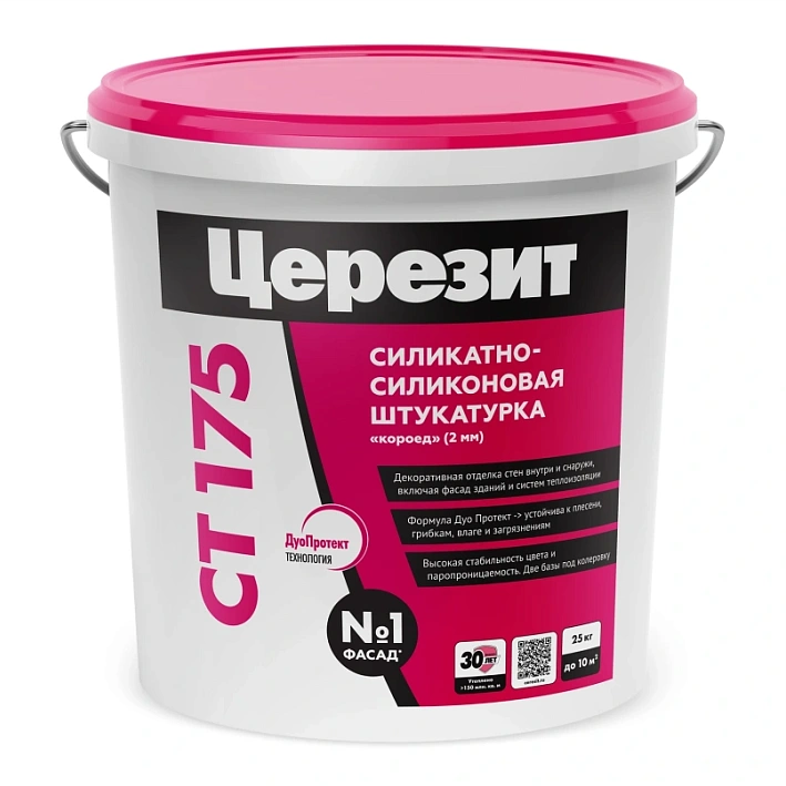 Декоративная штукатурка CT 175 предназначена для изготовления тонкослойных декоративных покрытий с зернистой и бороздчатой фактурой на бетоне, цементных и гипсовых штукатурках, гипсокартоне, древесностружечных плитах и т.д. внутри и снаружи зданий. Рекомендована для систем теплоизоляции фасадов с пенополистирольными (Ceresit VWS) и минераловатными (Ceresit WM) плитами.